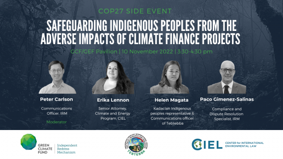 سيناقش هذا الحدث الجانبي، الذي يشارك في استضافته مركز القانون البيئي الدولي (CIEL) والمركز الدولي للشعوب الأصلية لبحوث السياسات والتعليم (Tebtebba) والآلية المستقلة للانتصاف (IRM) كيف تأثرت الشعوب الأصلية بمشاريع التنمية واسعة النطاق ومشاريع تمويل المناخ، وكيف ساعدت كيانات المساءلة عن المظالم مثل IRM في توفير اللجوء للشعوب الأصلية وغيرها ممن تأثروا مشاريع صندوق المناخ الأخضر.