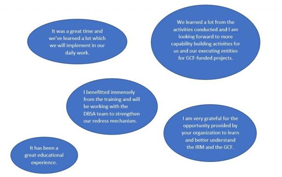 في المجموع 17 مشاركا من GRMs من كيانات الوصول المباشر (DAEs) التابعة لصندوق المناخ الأخضر (GCF)، عضو واحد في GCFفي فريق الاعتماد، وأربعة زملاء من GCFحضر هذا الحدث فريق الضمانات البيئية والاجتماعية وفريق من وحدة التقييم المستقل (IEU). عقدت ورشة العمل ونظمتها IRM ويسرها ديفيد فيرمان ، وهو مستشار خارجي من معهد بناء الإجماع (CBI).