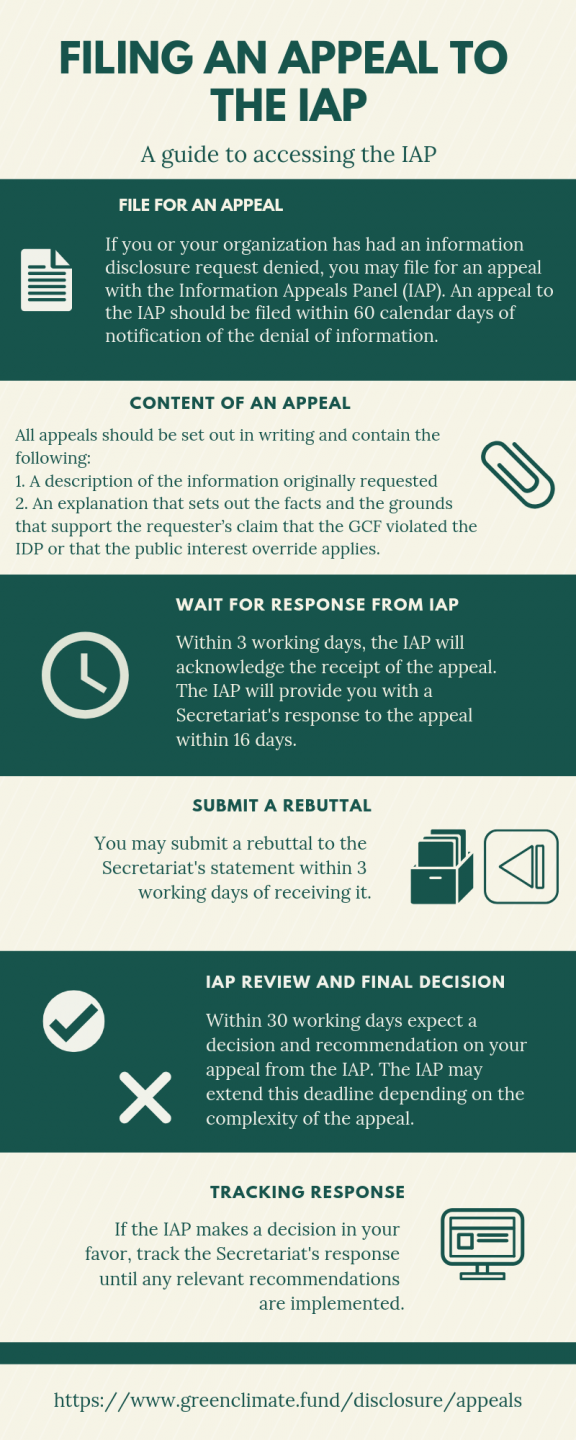In the context of the Information Appeals Panel (IAP), Principle 4 regarding justification for denials and the right to appeal is critical. When denying a request for access to information the GCF will provide an explanation for its decision. Requesters who believe they have been denied access to information in violation of the IDP have the right to appeal the decision via the IAP.