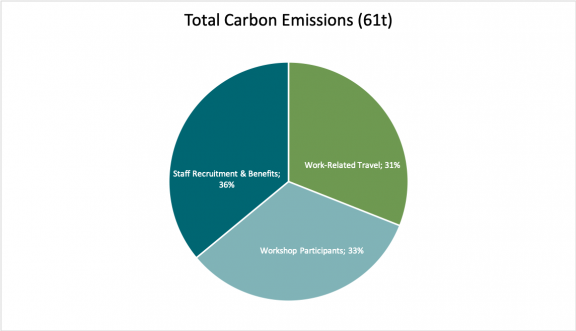 Although carbon equivalent, by definition, includes all the other sources of greenhouse gases such as methane and nitrous oxide, after a considerable amount of research, the IRM decided not to include them in our calculation. For the most part, these emissions are immaterial and even if they do exist, there is still a significant controversy on how much of these other greenhouse gases are actually released from aircraft. Accordingly, the IRM’s total CO2 emissions for 2019 is approximately 61 tonnes.[2] Two-thirds of these emissions fall under two categories, ‘Work-Related Travel’ and ‘Workshop Participants’, and the final one-third falls into the category ‘Staff Recruitment and Benefits’ which includes ‘Staff Recruitment’, ‘Staff Leave’, ‘Family Leave’ and ‘Staff Development and Training’. The major events that required travelling in 2019 consisted of an outreach workshop in Chile where the IRM sponsored seven regional flights for Civil Society Organisations (CSOs) and a capacity building training at the GCF’s headquarters in Songdo, South Korea, which 14 participants from Grievance Redress Mechanisms of Direct Access Entities attended. Furthermore, IRM staff participated in other outreach events such as the Annual Meeting of the Independent Accountability Mechanisms Network (IAMnet) in Abidjan, the United Nations Forum on Human Rights in Geneva and workshops with CSOs in Thailand, Bangladesh, Chile and China as well as one training course in the United States.